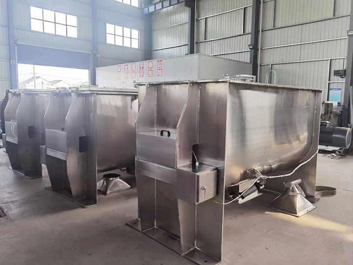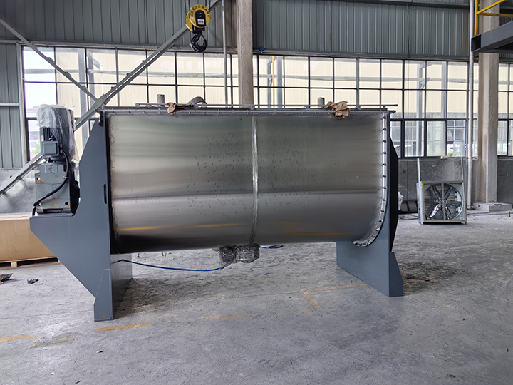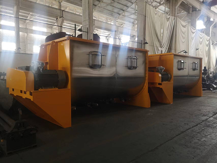臥式螺帶混合機是應用廣的單軸混合機,半開管狀筒體內的主軸上盤繞蝸旋形式且成一定比例的雙層螺帶。盤旋的螺旋帶依附主軸運轉,能推使物料隨螺旋帶蝸旋方向行進。混合機臥式筒體底部中央開設出料口,使筒體內物料出料無死角。